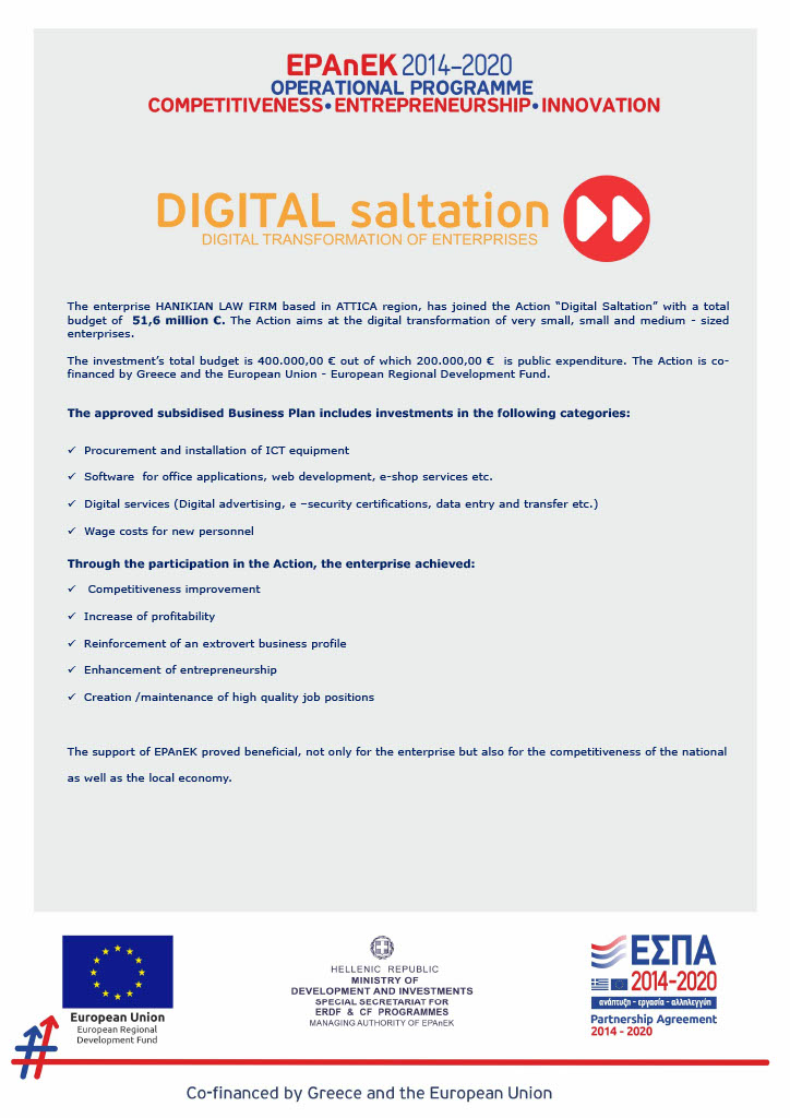 The Company with the name “HANIKIAN LAW FIRM” (hereafter referred to as for short the “Company”) beneficiary of the website www.hanikian.gr (henceforth and for the sake of brevity the “Website”) with the purpose of promoting the company, offers its services with the following in detail described terms of use, which each visitor of the above website, must read carefully and visit the page and its subpages only if you fully accept them. In case of disagreement, the user is requested not to use the website.